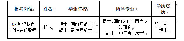 按照《关于印发<福建省省属事业单位公开招聘工作人员考试暂行办法>的通知》(闽人发〔2006〕11号)和《2024年福建船政交通职业学院专项公开招聘总量控制高层次人才方案(二)》等文件要求,经报名、资格审查、面试、考察、体检等有关程序,经学校党委会议研究,确定胡悦为08通识教育学院专任教师拟聘用人员,现予以公示。