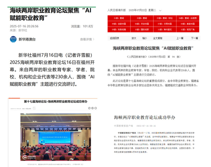 7月15日-17日,2025海峡两岸职业教育论坛在福建省福州市成功举行。此次论坛以“AI赋能职业教育”为主题,由中华职业教育社、福建省中华职业教育社联合台湾多家社会团体共同主办,福建船政交通职业学院承办,《教育与职业》杂志社协办。论坛期间,第十四届台湾青年研习营暨海峡两岸青年非遗技艺研学体验营同步举办。本次论坛获得了新华社、人民网、中国台湾网、中国教育报、经济日报、中国新闻网、中华职业教育社、福建省中华职业教育社、福建电视台、同心福建等十多家主流媒体报道。