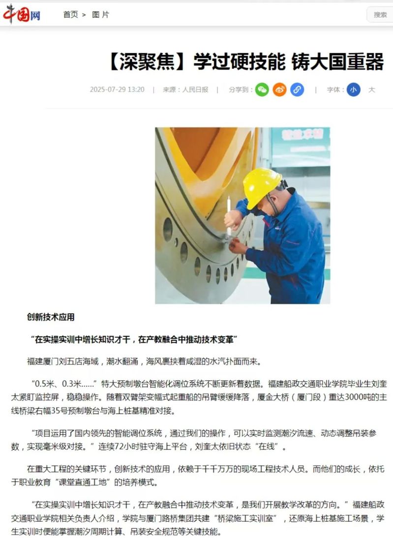 7月29日,人民网、新华网、光明网、中国网等中央主流媒体报道我院毕业生刘奎太参与厦金大桥(厦门段)建设,展现学院在产教融合育人方面所取得的显著成效。具体报道情况如下: