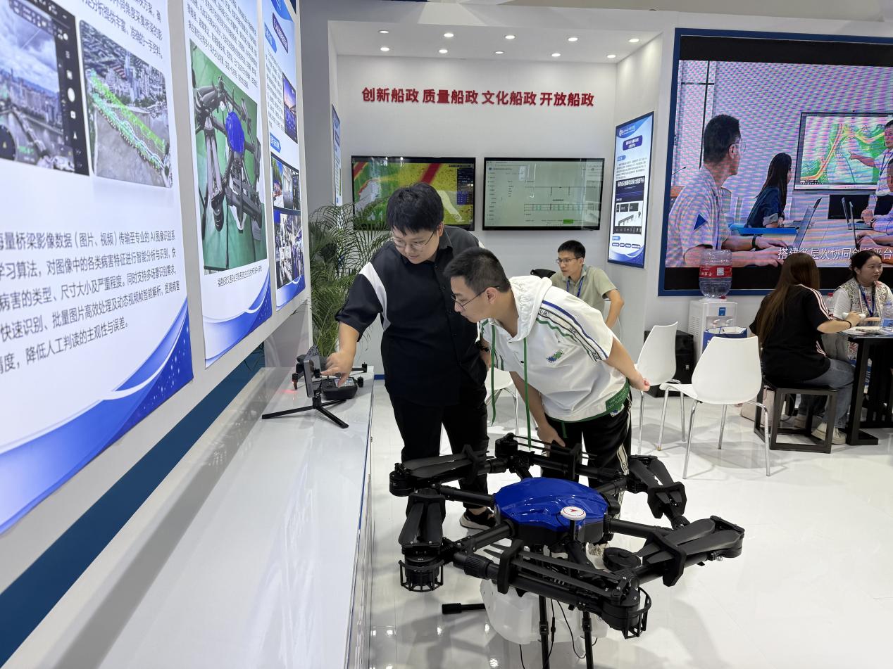 我院受邀参展并在主宾馆设立展区,重点展示了一系列兼具技术实力与应用价值的成果:包括传承船政文化的赶缯船结构复原模型,聚焦智能装备领域的 AIS 交通流分析系统、Ener16p 农业植保无人机、无人机协同指挥系统、桥梁无人机巡检及 AI 病害识别系统,深耕大数据应用的福建省交通基础设施大数据平台,以及荣获国家级教学成果奖的《新船政学堂:灯塔型航海人才双适任育训范式创新实践》项目。丰富多元的展品吸引了众多参会观众驻足咨询、互动体验并拍照记录。展区内的茶艺展示区更是成为交流热点,专家学者们在品茗畅谈间,围绕航海类专业人才培养、船政文化传承创新、区域海洋装备产业升级、国际人才联合培育等关键议题展开深度研讨。展览期间,我院的办学成果与特色展品获得多家官方媒体及自媒体的关注与宣传报道,有效提升了学院的行业影响力与社会知名度。