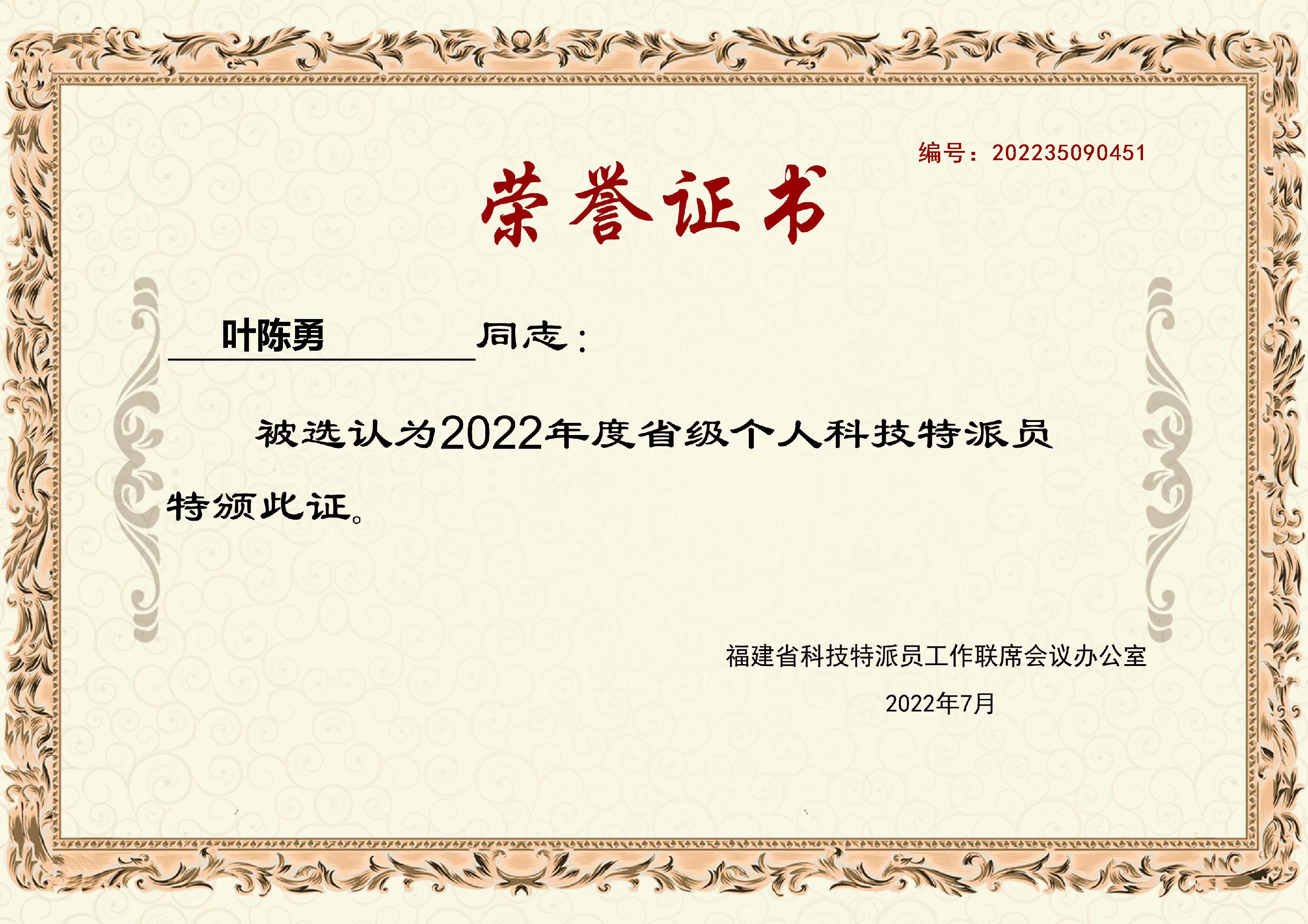 (五)2021年12月、2022年7月被福建省科技特派员工作联席会议办公室(福建省科学技术厅)选任为个人科技特派员、团队科技特派员