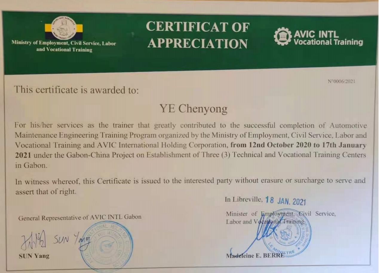 138天来,我们夜以继日,通过教学方式和理念的创新,逐一攻坚克难,解决困难,砥砺奋战,于2021年1月17日顺利完成加蓬职教项目。毕业典礼时,加蓬国家的教育部、科技部、劳工部领导都来到了现场,给予我们高度评价,并授予我们加蓬国家嘉奖状,这是我校获得的首个国际嘉奖。
