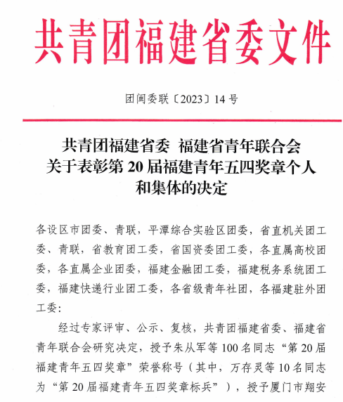 (一)2023年5月被共青团福建省委授予青年五四奖章