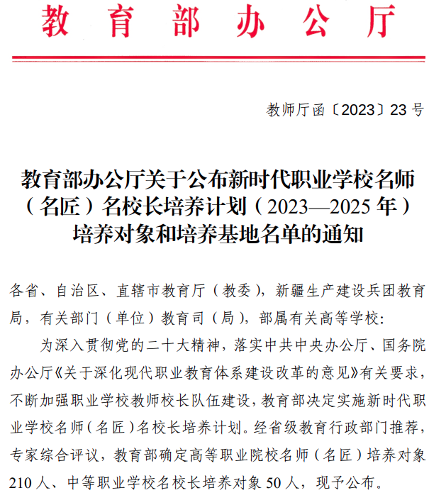 近日,教育部办公厅下发《关于公布新时代职业学校名师(名匠)名校长培养计划(2023—2025年)培养对象和培养基地名单的通知》,确定高等职业院校名师(名匠)培养对象210人、中等职业学校名校长培养对象50人。我院房曰荣教授入选为高等职业院校名师培养对象。