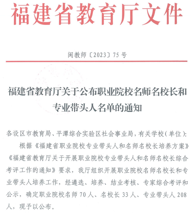 近日《福建省教育厅关于公布职业院校名师名校长和专业带头人名单的通知》(闽教师〔2023〕75号),经福建省教育厅遴选、培养、结业考核、专家综合考评和公示,我校房曰荣、陈秀华被确定为福建省高职院校名师,高汝武被确定为福建省高职院校名校长,陈明仙、翁国玲、陈天炎、黄金凤、苏庆列、李翼被确定为福建省高职院校专业带头人。