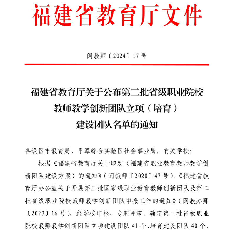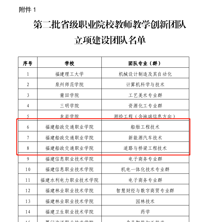 近日,福建省教育厅印发《关于公布第二批省级职业院校教师教学创新团队立项(培育)建设团队名单的通知》,确定第二批省级职业院校教师教学创新团队立项建设团队41个、培育建设团队40个。我院船舶工程技术、新能源汽车技术、道路与桥梁工程技术等三个团队入选省级职业院校教师教学创新团队立项建设团队。