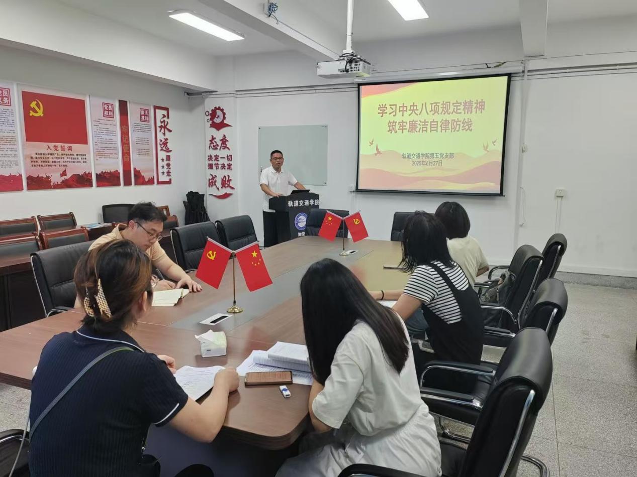 2025年6月27日,轨道交通学院第五党支部书记陈宏意以“学习中央八项规定精神 筑牢廉洁自律防线”为主题,为支部教师党员讲授专题党课。