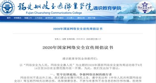 根据学校宣传统战部《关于开展国家网络安全宣传周活动的通知》要求,我院围绕“网络安全为人民,网络安全靠人民”开展了2020年国家网络安全宣传周活动。