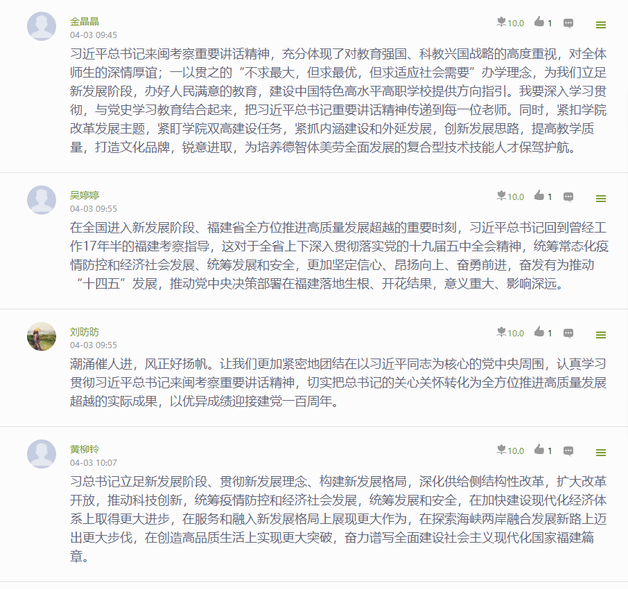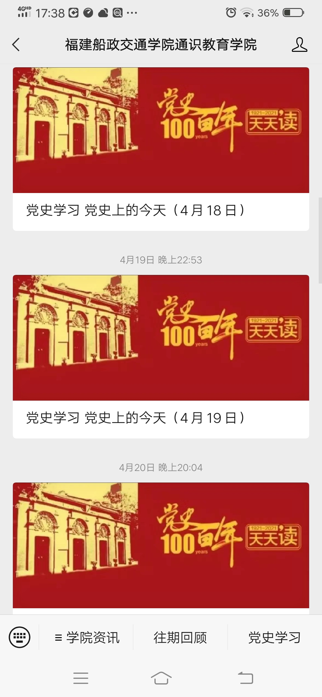 通识教育学院党总支创新党史学习教育形式,利用“学习通”线上党建平台的讨论和作业等模块,开展党史学习教育,以及党史和习近平总书记来闽考察重要讲话精神应知应会线上测试,增强学习实效。同时,每日在网页和微信公众号上推送“党史上的今天”和党史学习相关内容,通报总支党员前日总支“学习强国”积分情况,督促每位教师认真学习。