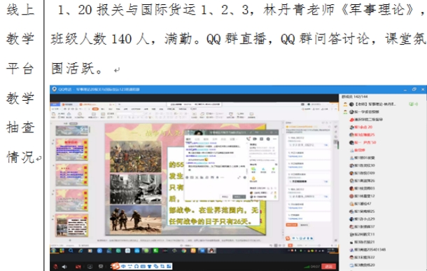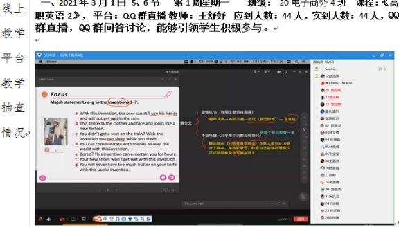 2、授课教师都能够对线上平台技术、操作流程、交流互动、教学资源使用等方面的掌控愈加熟练,对线上教学的各种优势愈发喜爱。学生学习整体上热情较高,普遍认为授课教师能备课充分,教学认真,课件丰富,内容容量大,对学生课堂签到管理负责,师生互动方式灵活,学生参与度、活跃度高,教学效果良好。