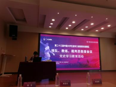 比赛期间,组委会将党史学习教育与赛事相结合,在领队、教练、裁判员联席会上举办“党史学习教育”。活动内容详实,梳理了习近平总书记主政浙江期间制定的“八八战略”,深入介绍习近平总书记如何将欠发达乡镇村列入工作规划、纳入整体发展框架,进行专门安排和部署。本次党史学习教育让各领队、教练、裁判员在外出比赛之余收获满满,收到高度肯定。会后,我院第二党支部郭建忠书记在宿舍内分别对男女篮球队队员召开座谈会,向同学们介绍习近平总书记在浙江的工作事迹,解析了在全球疫情肆虐的环境下,我国各项体育赛事仍在顺利开展的原因,体现了我党在疫情防控方面做出的卓越贡献。会后同学们纷纷表示,当前的比赛机会来之不易,彰显我国社会主义制度的优越性,我们要珍惜机会,每个同学都要有一颗爱国爱党的心。通过此次活动,极大激发了同学们的爱国主义情怀,达到“以体育德 以赛育人”的育人目标。