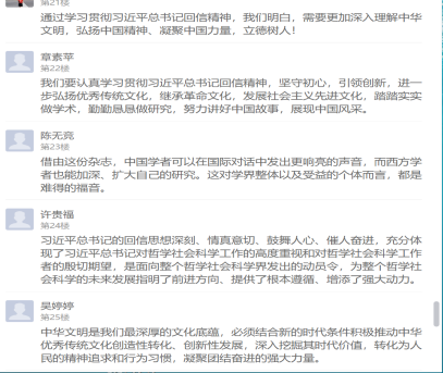 大家一致表示,深受教育、深受鼓舞、倍感振奋,将认真学习贯彻习近平总书记重要指示精神,在工作和学习中坚守初心、引领创新,展示高水平研究成果,弘扬中华文明,让世界更好地认识中国、了解中国。