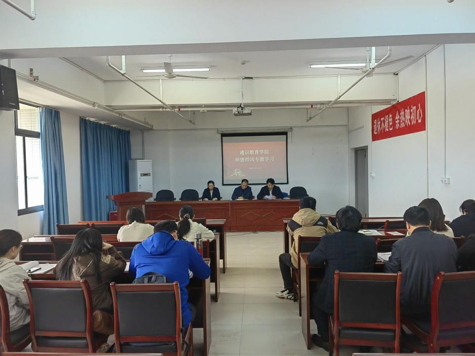 为进一步加强教师思想政治教育和师德师风建设工作,落实立德树人根本任务,引导教师坚守教育初心,践行育人使命,规范从教行为,4月24日下午,通识教育学院在鉴知楼10楼大会议室召开师德师风专题学习会。金晶晶副院长领学教育部《关于印发新时代高校教师职业行为十项准则的通知》,展示教学事故典型案例,要求全体教师自觉遵守师德师风规范,敬业爱生、为人师表,以新时代高校教师职业行为十项准则和我校教师职业道德规范为准则,规范自己的行为,涵育高尚师德师风,恪守职业“红线”,严守法纪“底线”,高尚的职业道德和优良的工作作风当好学生的“引路人”。