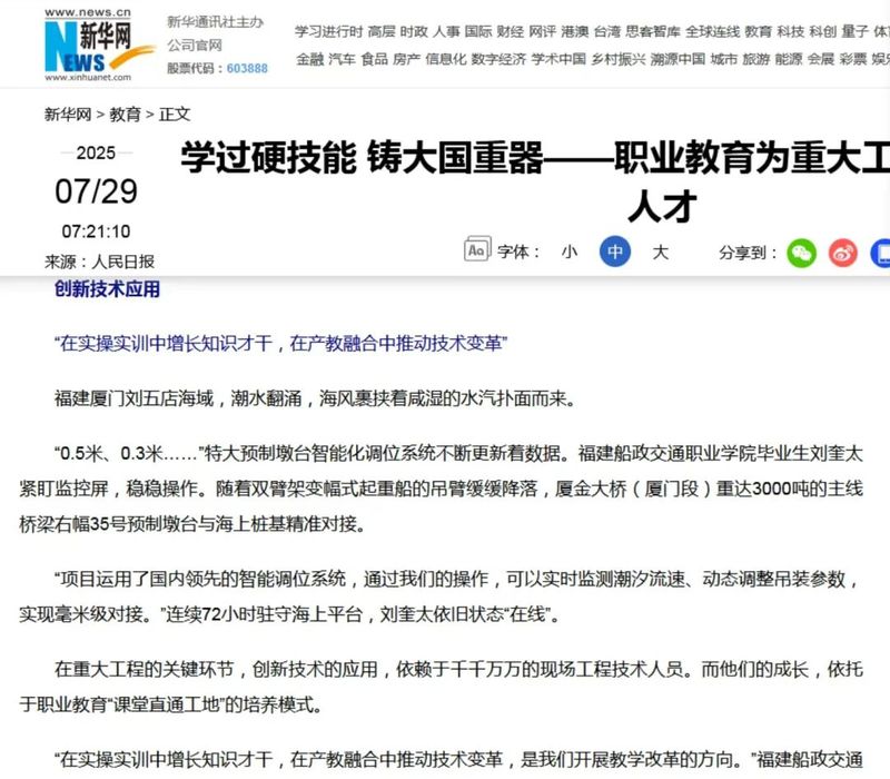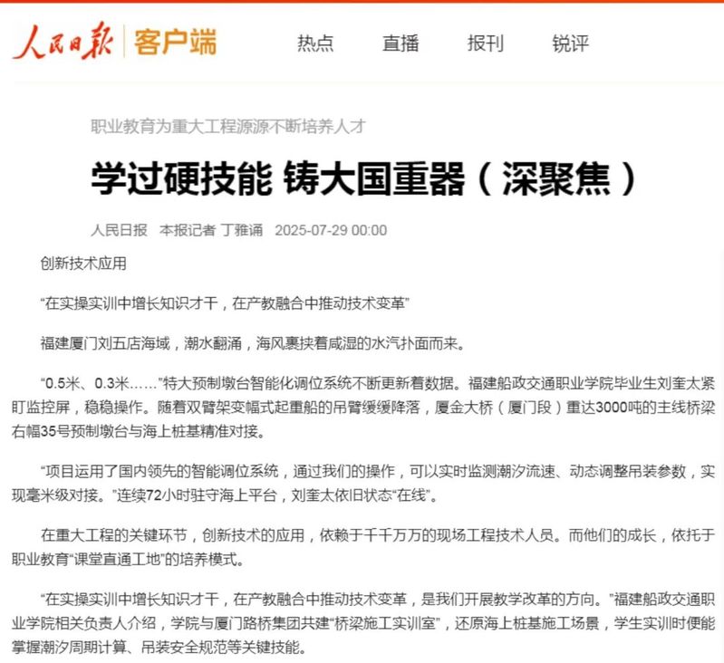 7月29日,人民网、新华网、光明网、中国网等中央主流媒体报道我院毕业生刘奎太参与厦金大桥(厦门段)建设,展现学院在产教融合育人方面所取得的显著成效。具体报道情况如下: