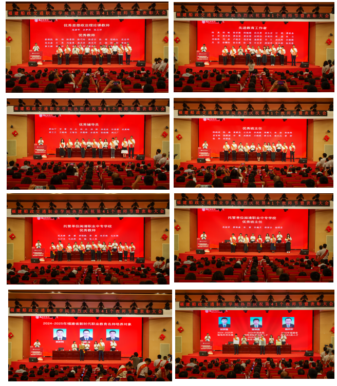 会议在庄严的国歌声中拉开序幕。大会对2024-2025学年获得学院优秀教师、先进教育工作者、优秀辅导员、优秀班主任,福建闽清职业中专学校优秀教师和优秀班主任,享受政府特殊津贴高技能人才、福建省高层次人才、极地科考先锋,福建省教学成果奖特等奖、一等奖,世界职业院校技能大赛金奖指导教师,第二批国家级教师教学创新团队,全国样板支部、全国“双带头人”教师党支部书记“强国行”专项团队,全国模范职工之家、福建省劳模工匠创新工作室、福建省工匠学院的个人和团队代表进行颁奖。