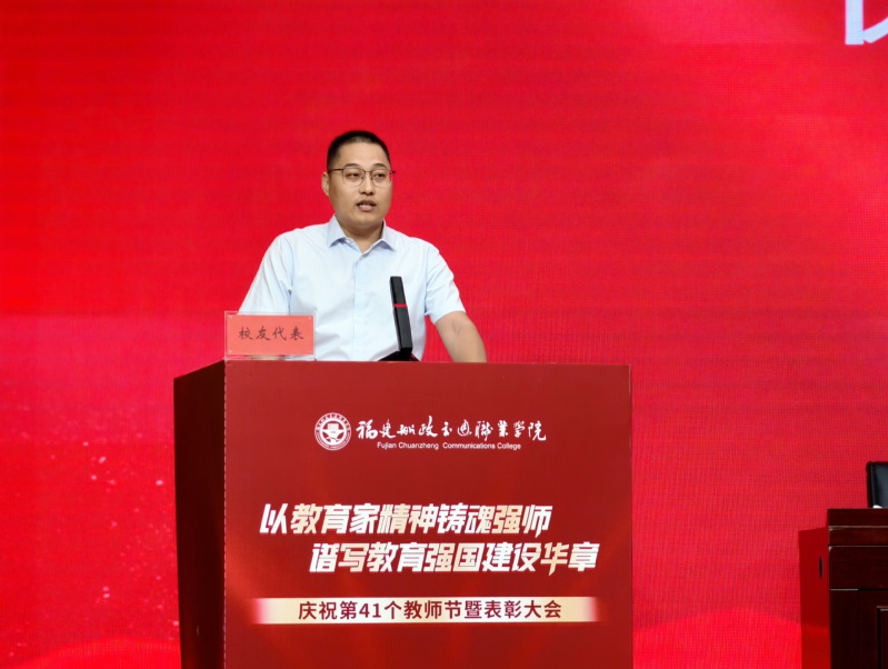 来自安全与环境学院24级安全技术与管理专业的刘滨福同学,作为学生代表为全体教师送上真挚祝福,他分享了自己从军旅到重返校园的心路历程,感谢老师们的悉心教导,并表示将以更加坚定的信念和实际行动回报师恩、不负青春。