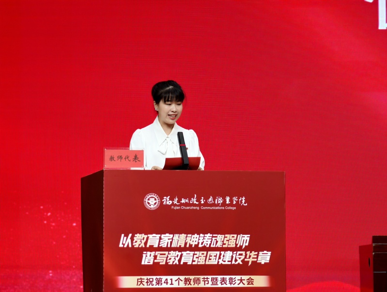 9月10日下午,我院举行庆祝第41个教师节暨表彰大会。党委书记陈宜大,党委副书记、院长陈群,党委副书记张辉,纪委书记谢建山,副院长陈常晖出席会议。会议由陈常晖主持。全体教职工、荣退人员代表、福建闽清职业中专学校代表、校友代表、学生代表欢聚一堂,共同参加此次会议。本次庆祝表彰大会采用线下会场和线上直播同步进行。