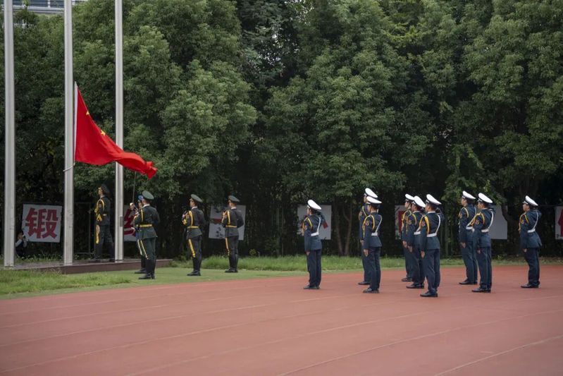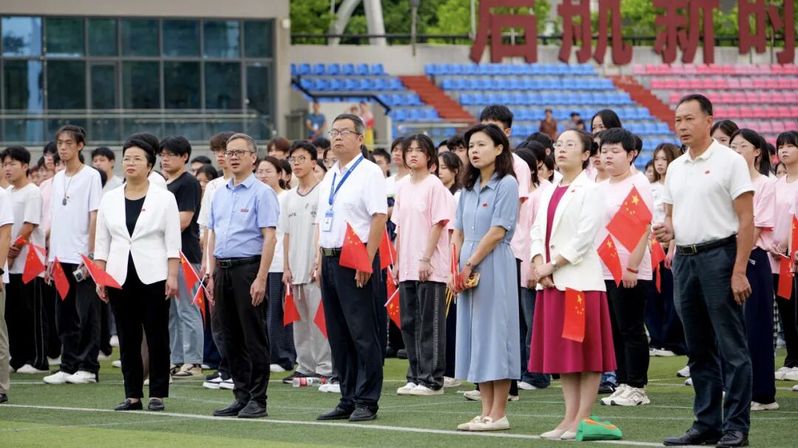 校国旗护卫队迈着铿锵坚定的步伐昂首前行,每一步都饱含赤诚;鲜艳的五星红旗在朝阳映照下,于师生的肃立注目中冉冉升起、迎风展扬。嘹亮国歌回荡校园,师生目光紧紧追随着国旗,“青春向党,强国有我” 的信念,在这庄严时刻深深镌刻心间。