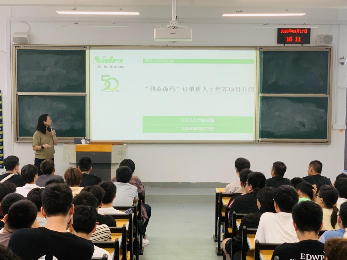 订单班合作企业-利莱森玛电机科技(福州)有限公司企业人事经理代表企业上台发言。其先是介绍了企业的发展历程、行业地位与核心业务,让新生对合作企业有了全面了解;接着,重点解读了电气专业订单班的培养体系,包括“校企共同制定人才培养方案”“学生进入企业实习实训”等特色环节,清晰展现了订单班“工学结合、精准育人”的优势,为新生提供了一条“入学即接轨职场”的成长通道。