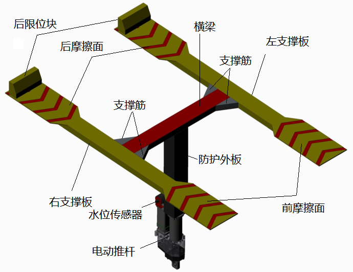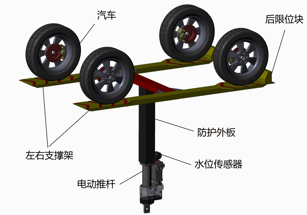 该套装置能够有效避免“水淹车”情况的出现。汽车停靠在左右支撑架上,支撑架通过中间横梁连接,下面设置有电动推杆和水位传感器,水位传感器能够实时监测车外水位情况,当达到警戒水位时,电动推杆就够驱动整套架体的提升,避开水位。