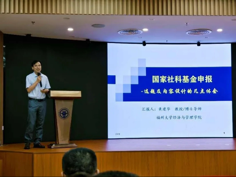 活动邀请了福州大学经济与管理学院黄建华教授作主题讲座。黄建华教授是福州大学物流研究院副院长、福建省高层次人才、博士生导师,国家社科基金通讯评审专家,福建省、湖南省、河北省、江西省等省份的自然科学基金项目函评专家;兼任教育部学位中心博士论文、硕士论文评审专家,福建省政府投资项目评审专家、福州市发改委项目评审专家;福建省应急厅应急管理专家。讲座以“国家社科基金申报”为题,为参会的博士教师们作了精彩报告。黄教授围绕国家社科基金项目的指南走向、选题原则、论证活页和申报书撰写技术细节等视角展开分享。他强调虽然国社科从课题指南发布到提交时间比较短,但中标的课题一定是一个长期思考与积累的结果。他鼓励与会教师,将个人学术研究兴趣与国家和社会发展相融合,积极申报,反复打磨,争取尽早取得突破。