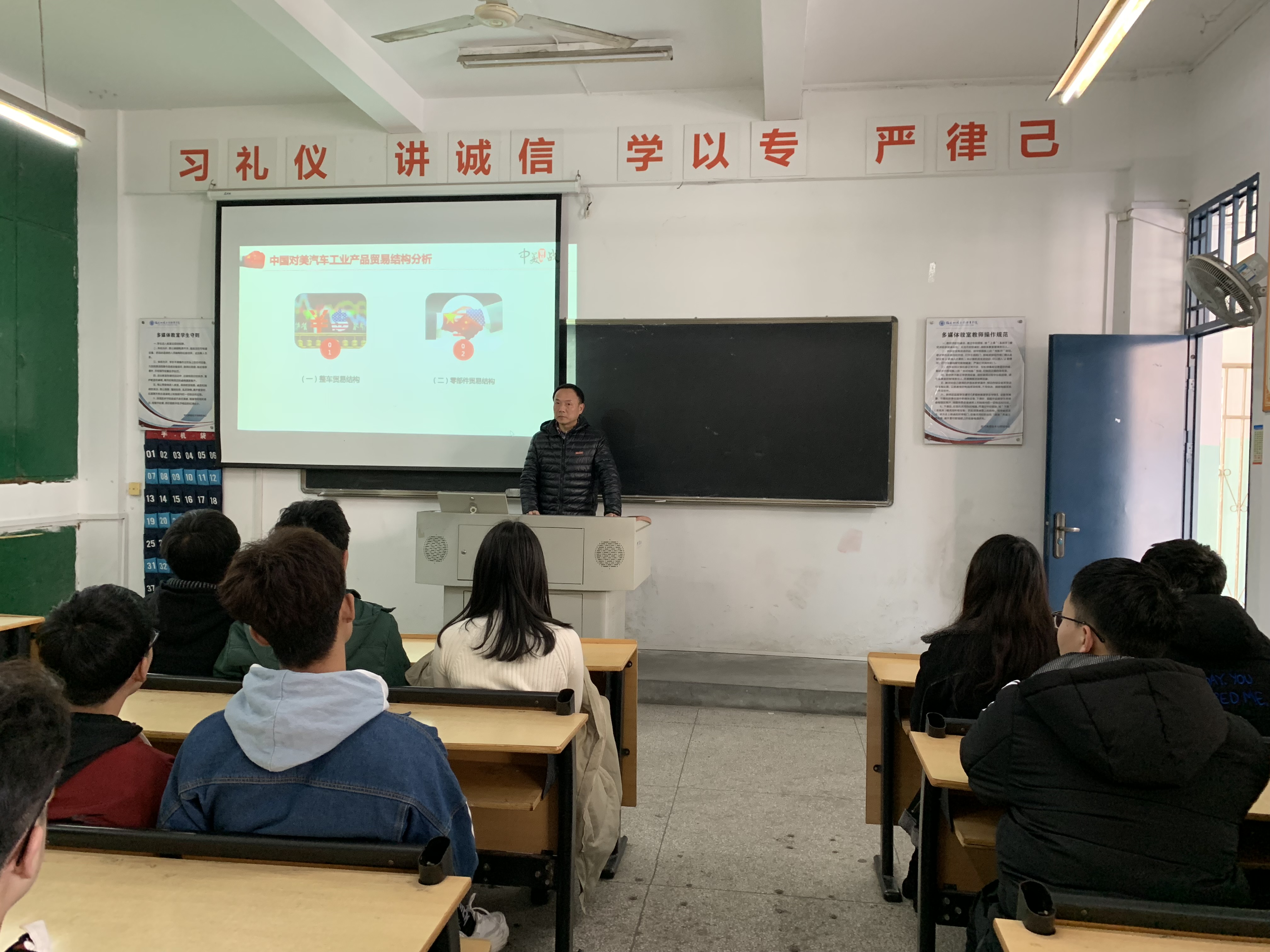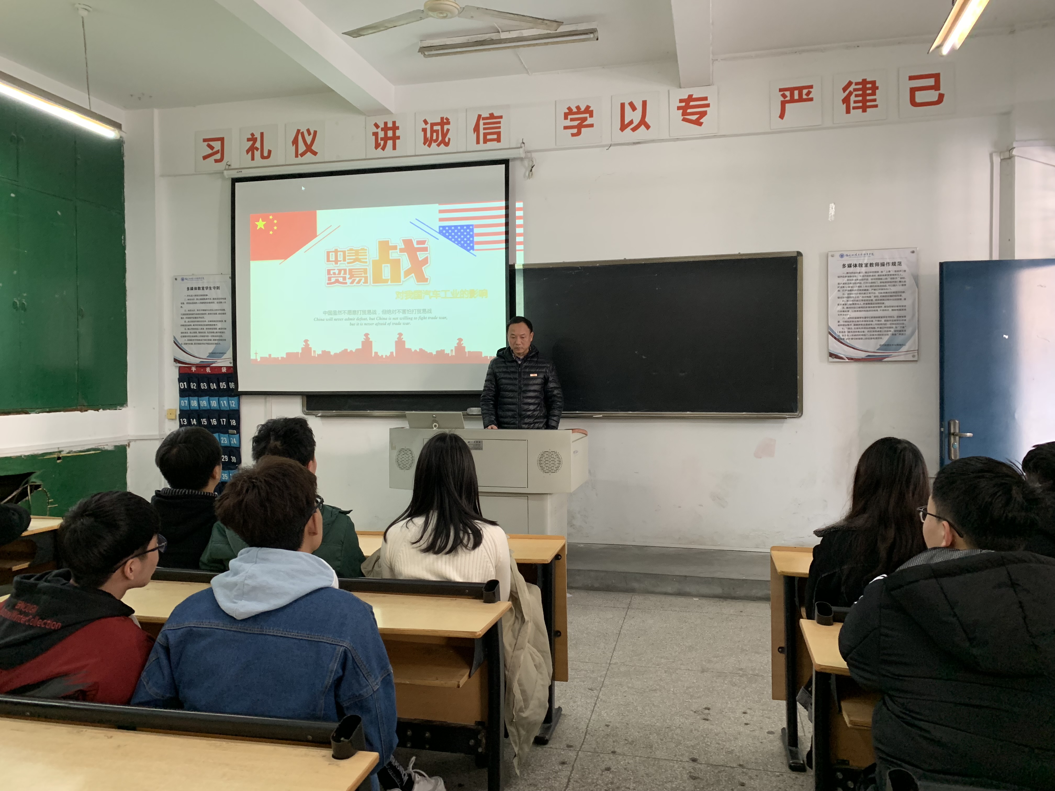 20181130张荣贵主任汽车运用工程系22号楼103教室进行了“中美贸易摩擦对我国汽车工业的影响”为主题的报告。参加了此次形势与政策讲座的有汽车系教工党员代表以及各班班长、团支书和优秀学生代表。