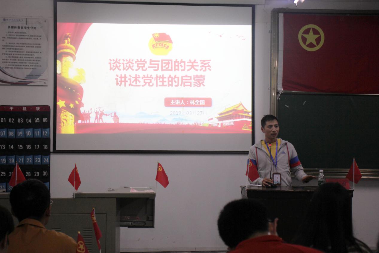 团课上辅导员林全国老师介绍了党和共青团关系并强调,共青团永远是党的助手和后备军