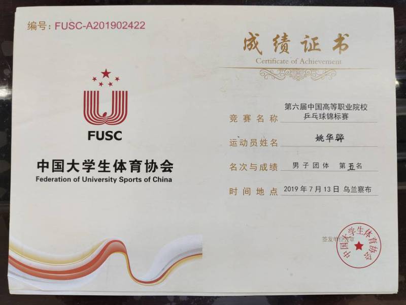2019年7月10日至13日,我系2018级汽车营销与服务1班学生姚华骅、2017级汽车运用与维修技术1班刘山西等同学,在内蒙古乌兰察布职业学院举行的第六届中国高职院校乒乓球锦标赛中,通过与全国33所院校近180名运动员的激烈角逐,最终获得全国男子团体第五名的历史最好成绩。