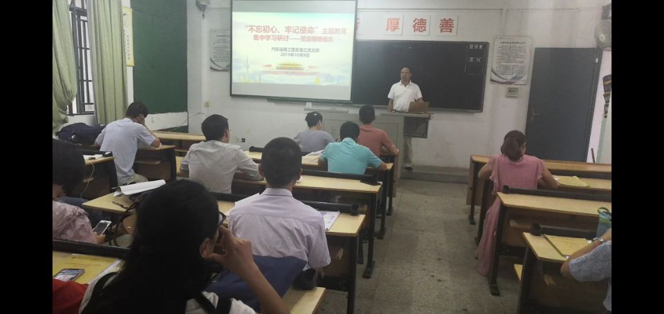 2019年10月9日,汽车系第三党支部全体党员,围绕“不忘初心、牢记使命”主题教育开展第二次专题学习研讨,主题为坚定理想信念。会上,张荣贵老师做重点发言,詹华和吕翱老师互动发言。张老师指出坚定理想信念,必须坚定“三个自信”,理想信念是共产党人精神上的钙。作为党员领导干部,一定要坚定理想信念,最关键在于坚定“三个自信”,即道路自信、理论自信、制度自信。作为在船政工作的同志,要深刻理解“三个自信”,切实增强“三个自信”,自觉围绕“四个全面”谋划工作,自觉围绕贯彻落实《若干意见》加快学校振兴发展来推进工作。