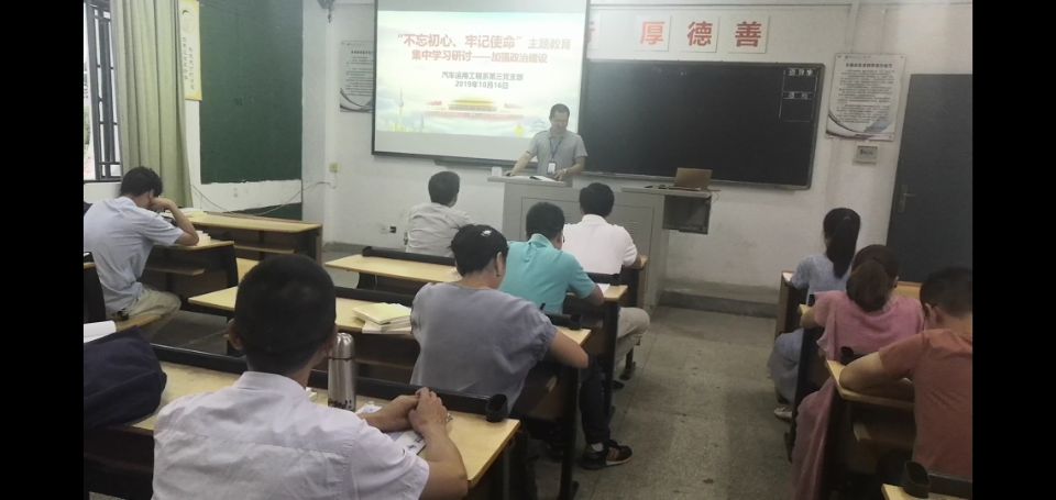 2019年10月16日,汽车系第三党支部全体党员,围绕“不忘初心、牢记使命”主题教育开展第三次专题学习研讨,主题为加强政治建设。会上,林可春老师做重点发言,余红燕、李智强老师互动发言。林老师指出没有规矩不成方圆,严明党的纪律,首要的就是严明政治纪律。党的纪律是多方面的,但政治纪律是最重要、最根本、最关键的纪律,遵守党的政治纪律是遵守党的全部纪律的重要基础。政治纪律是各级党组织和全体党员在政治方向、政治立场、政治言论、政治行为方面必须遵守的规矩,是维护党的团结统一的根本保证。