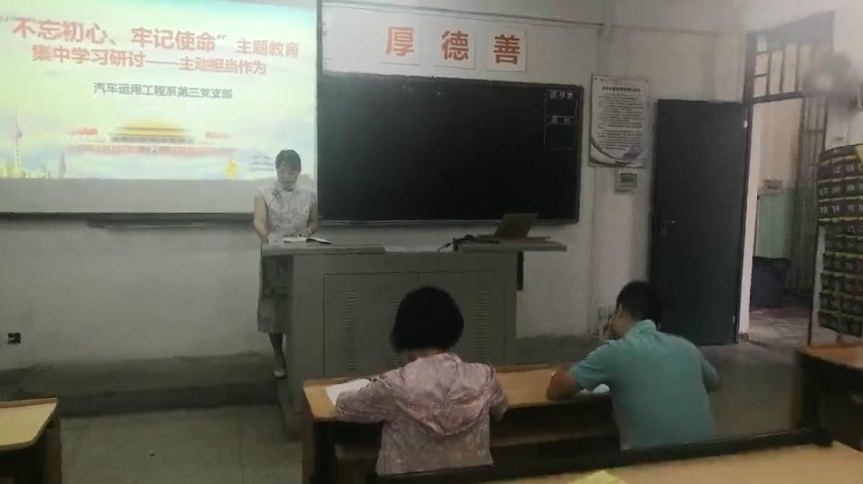 2019年10月17日,汽车系第三党支部全体党员,围绕“不忘初心、牢记使命”主题教育开展第四次专题学习研讨,主题为主动担当。会上,陈燕老师作重点发言,陈宁、朱剑宝老师作互动发言。陈老师指出敢于担当既是党员干部必须坚持的从政准则,又是党员干部切实推进实际工作的成事之要。广大党员干部应深入学习习近平总书记关于责任担当的重要论述,将其全面、认真地贯彻到作风建设及业务建设中,切实肩负起时代所赋予的重任。