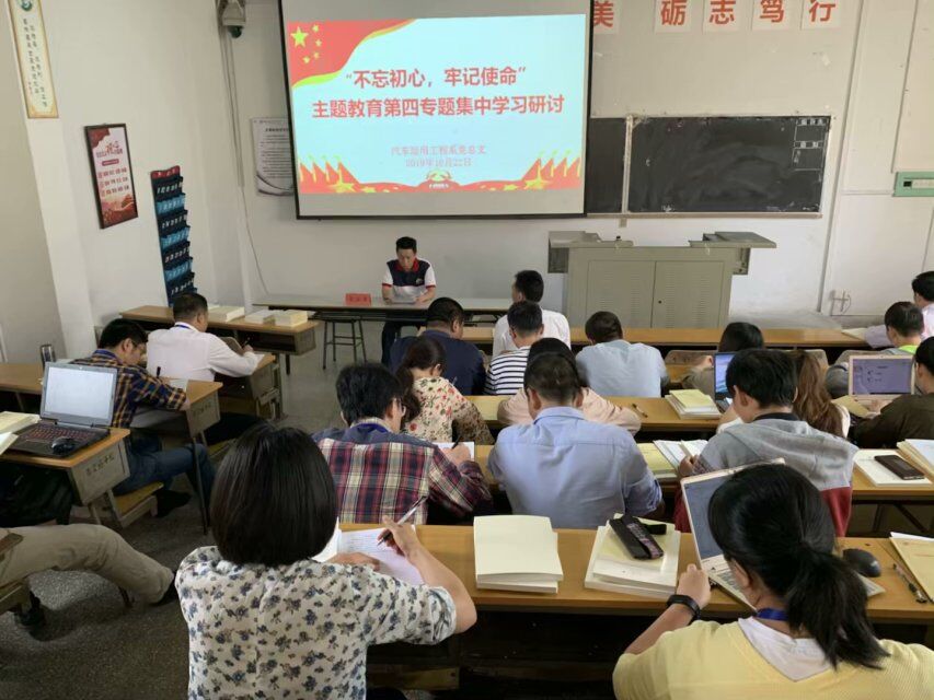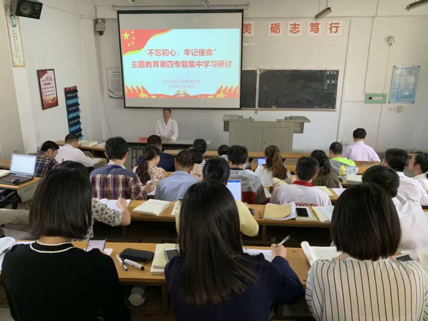 按照汽车运用工程系党总支“不忘初心、牢记使命”主题教育学习研讨方案安排,10月22日下午,系党总支召开主题教育第四专题集中学习研讨会。系部全体教职工党员参加了会议。