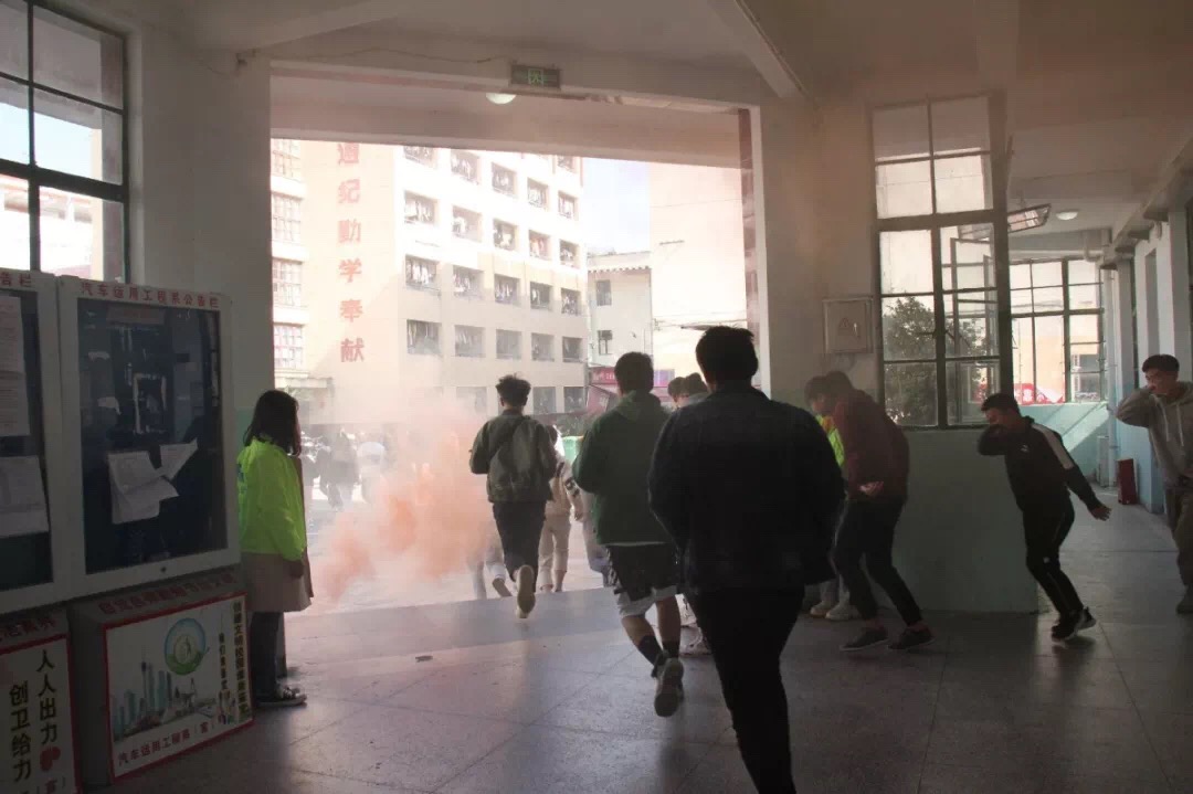 本次活动,系部制定了详细的演练活动方案,对各岗位的分工职责作出了明确部署,划定了各班级的逃生疏散路线,配备了烟雾模拟器,以接近真实效果、还原逼真场景。本次演练活动,是模拟因教室电脑故障产生火花,从而引发火灾。中午12点整应急疏散演练正式开始,浓烟滚滚,警报长鸣,工作人员向同学们广播:“撤离广播,撤离广播,汽车系教室发生火灾,全体学生听到广播以后紧急疏散,注意不要慌乱,听从指挥,有序撤离。”相关老师听到广播立即到达指定岗位,指导学生快速按照指定路线撤离疏散。在各层疏散引导人员的指挥下,全体学生整齐有序地到达指定场地,按班级进行集中点名,各班将点名结果汇报辅导员。