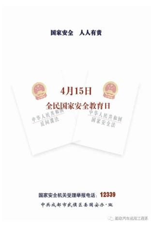 18汽营一班 张晓玲 汽车系学生会主席团成员:“国安才能国治,治国必先治安"。4月15日,是国家安全教育日,更准确的说法是全民国家安全教育日,今年的4月15日是首个全民国家安全教育日。今天学校组织我们观看全民国家安全教育日的直播,其实很多的危险都潜藏在我们的身边,我们应该小心谨慎面对。国泰民安是人民群众最基本最普遍的愿望,我们不仅仅要在这一天学习国家安全知识,而应该融入现实的每一天里,好好保护我们的祖国。