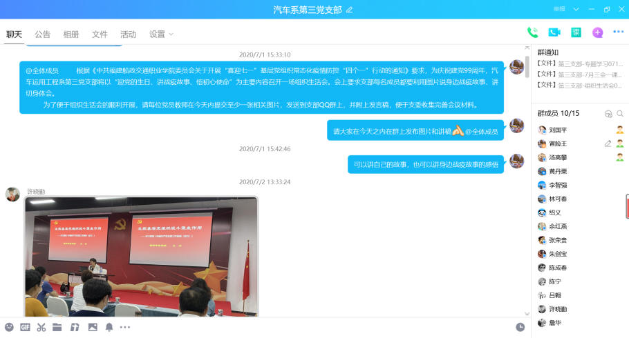 为了保证活动的顺利举办,支委提前利用第三党支部的QQ群发布通知,号召每位党员同志收集身边的战疫故事图片,发布到群上。