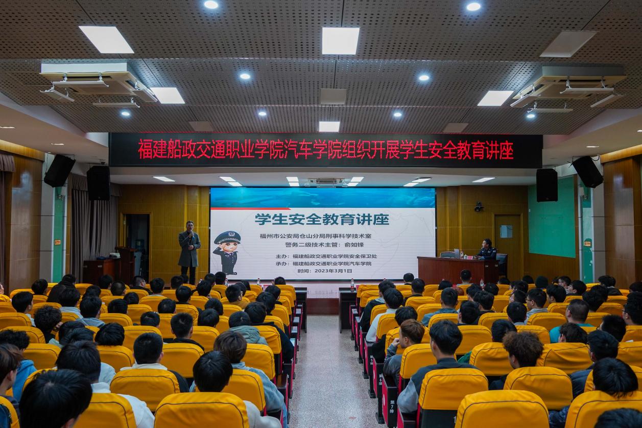 为加强学生安全教育,普及安全知识,提高学生自我保护意识,3月1日晚上7点,由福建船政交通职业学院安全保卫处主办、汽车学院承办的学生安全教育讲座在1号楼学术报告厅开展。本次讲座由福州市公安局仓山分局刑事科学技术室警务二级技术主管俞如锋警官主讲。