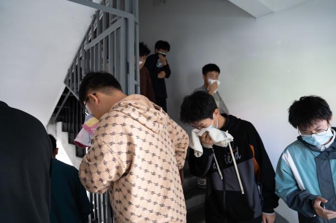 中午12:30,伴随着警报声长鸣,应急疏散演练正式开始,各楼栋、各楼层在班级班长和宿舍长的统一引导下,全体同学立刻作出响应,用湿毛巾捂住口鼻,猫着腰,迅速从安全通道进行疏散,到达指定地点后,由纪保部疏散演练小组清点人数,并向陈泽承老师汇报各班级集合情况。