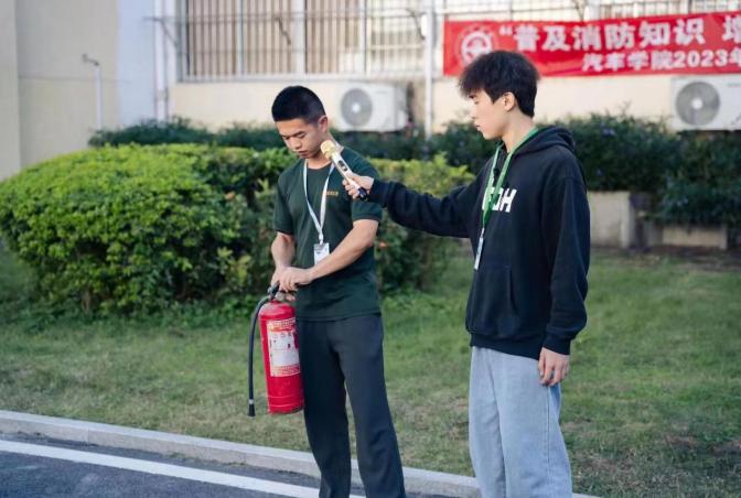 到达24号楼篮球场空旷地带后,纪保部灭火演练小组在火坑中点燃了事先准备好的易燃物,由汽车学院自律会副主席谢智弘向广大同学进行灭火器基本知识普及,并现场演示了灭火器的使用步骤规范,随后各班学生代表纷纷上前动手操作。