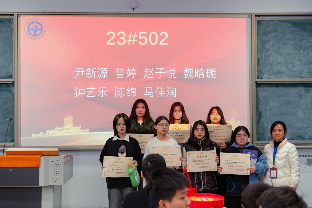 接着,由汽车学院辅导员黄唐芬、朱慧君、林思远老师分别上台,为带班宿舍获奖的同学颁发“文明宿舍先进个人”荣誉证书和精美奖品。