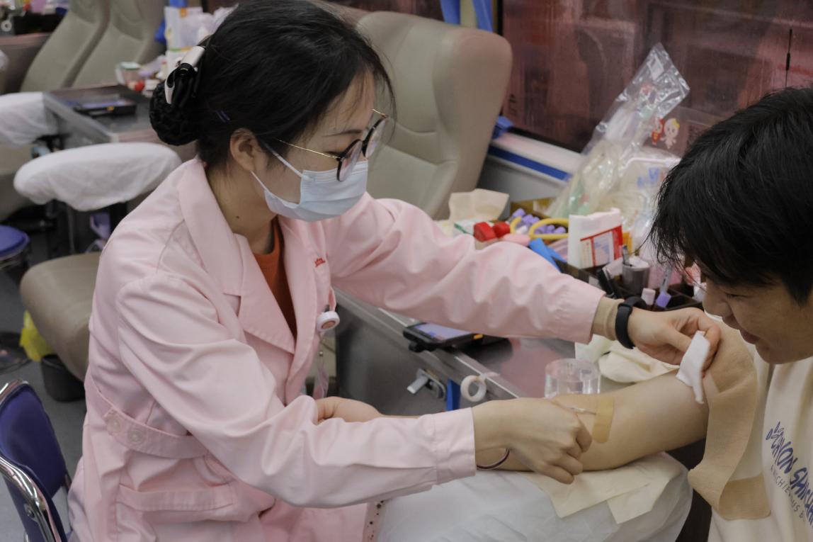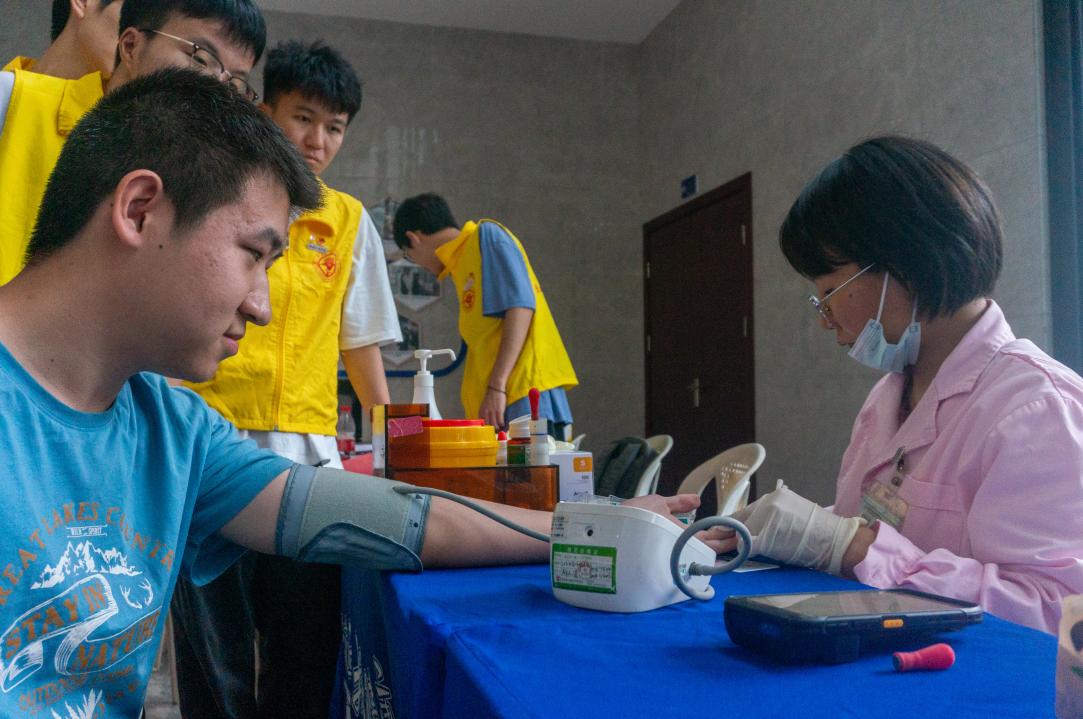 登记好了身份信息之后,为确保同学们做好了献血准备,医务人员将测量献血者血压,询问是否有贫血、高血压等不适宜献血的体征,接着采集血样,进行血型检测查看是否符合献血标准。
