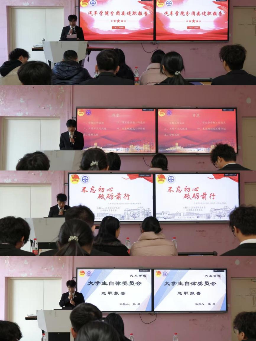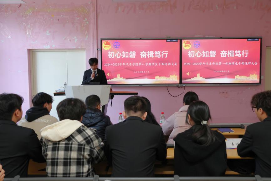 为贯彻落实习近平总书记关于青年工作的重要论述,聚焦学院发展,推动团学工作进步,强化思想引领,提升学院两委学生干部的综合素质,汽车学院分团委于2024年12月18日在北区2号楼1-3教室,召开了2024-2025学年第一学期两委学生干部述职大会。