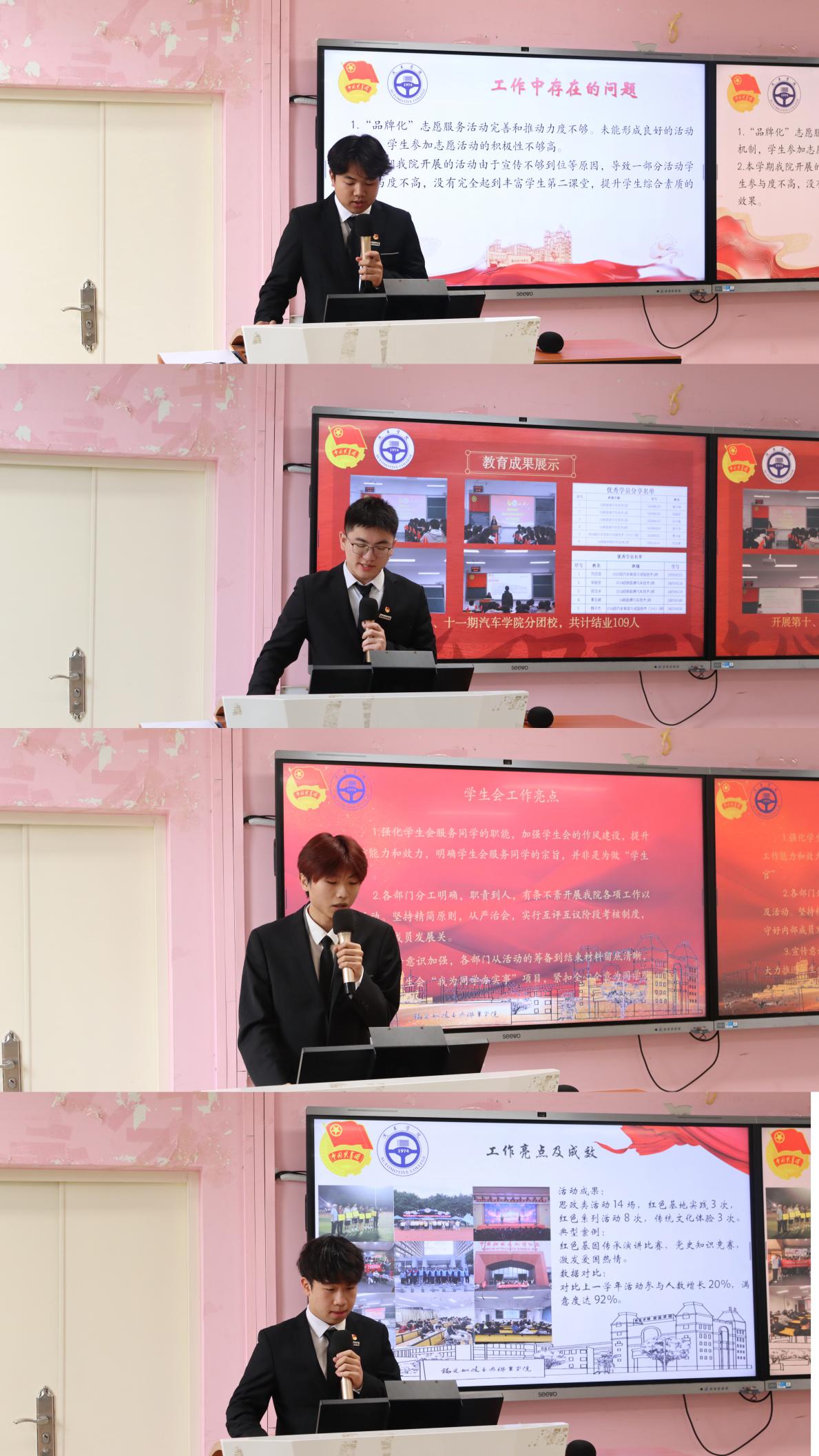 会上,汽车学院两委的15个部门学生负责人依次上台进行述职,结合各部门常规工作和特色活动以图文并茂、数据分析等形式呈现本学期部门工作完成情况,同时剖析不足、复盘反思并提出合理的改进措施,最后对部门下学期的工作进行规划与展望。
