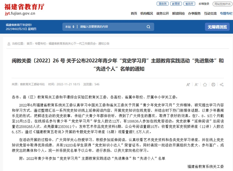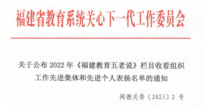 日前,福建省教育系统关工委公布了2022年《福建教育五老说》栏目收看组织工作先进集体和先进个人表扬名单、2022年青少年“党史学习月”主题教育实践活动“先进集体”和“先进个人”名单以及 2022 年“读懂中国——共话百年奋斗, 争做时代新人”舞台剧评审结果,我校关工委荣获先进集体2个,先进个人1名,舞台剧《党徽》荣获最佳作品奖。