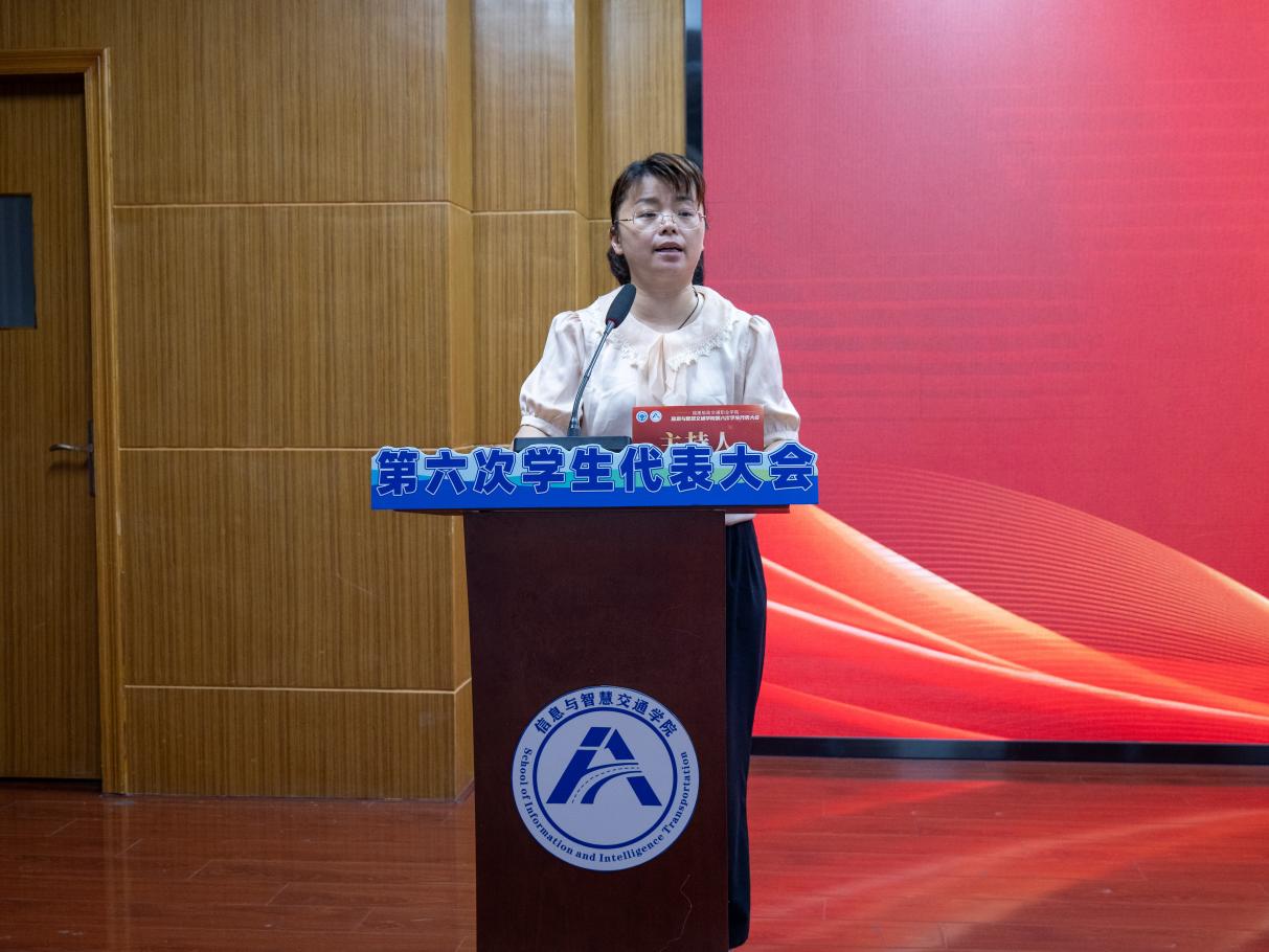 信息与智慧交通学院分团委副书记沈晨晞老师代表学院分团委向大会的召开表示热烈的祝贺。她寄望于全体学生代表大会代表要始终以习近平新时代中国特色社会主义思想为指导,切实肩负起团结引领青年学生紧跟党的领导的政治责任。要把服务同学、促进学生成长成才作为核心任务,将服务宗旨贯穿于学生会工作的全过程。同时,聚焦学生会深化改革与自身建设,通过从严治会、培育清新文化来不断提升组织效能,推动学生会规范化发展,让学生会真正成为党联系青年学生的坚实桥梁和纽带。