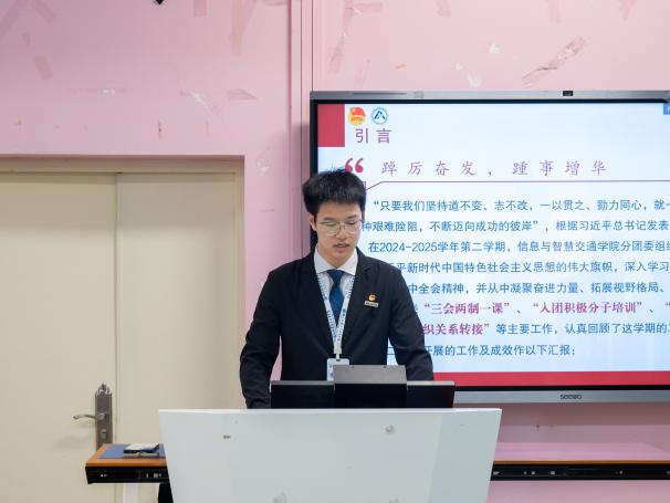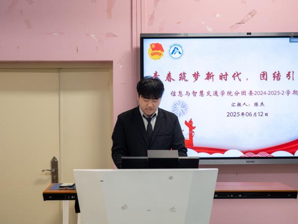 为总结2024-2025学年第二学期工作成效,凝聚团学组织发展动能,推动学生工作在新时代教育实践中提质增效,2025年6月12日,信息与智慧交通学院2024-2025-2学期两委干部述职大会在福道园自强楼2-3教室举行。学院分团委副书记沈晨晞、学院团组织学生干部、学院学生会工作人员及学生代表参加会议。会议由学院分团委兼职副书记(学生)朱翠琪主持。